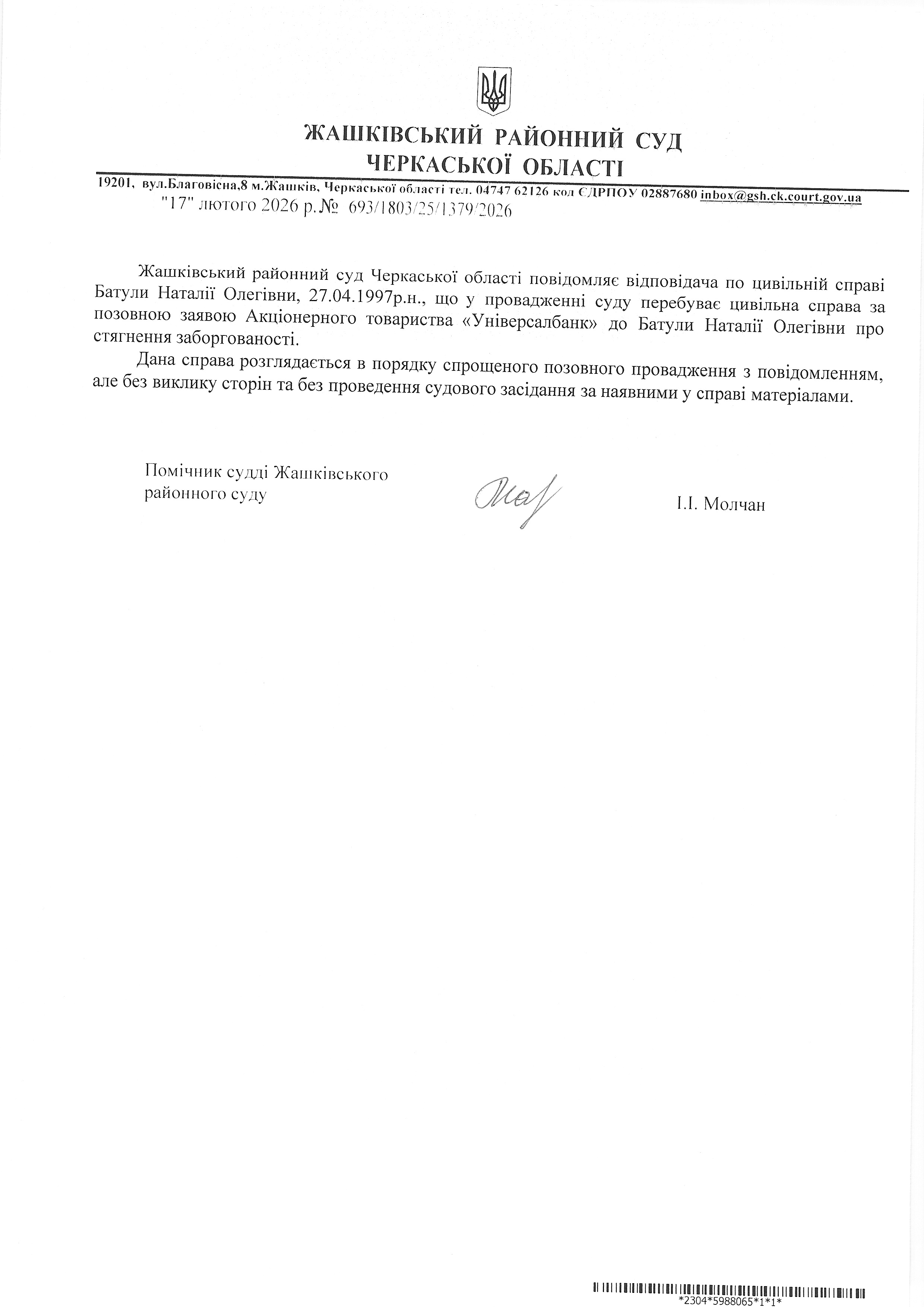 Оголошення про виклик у судове засідання Батули Н.О.