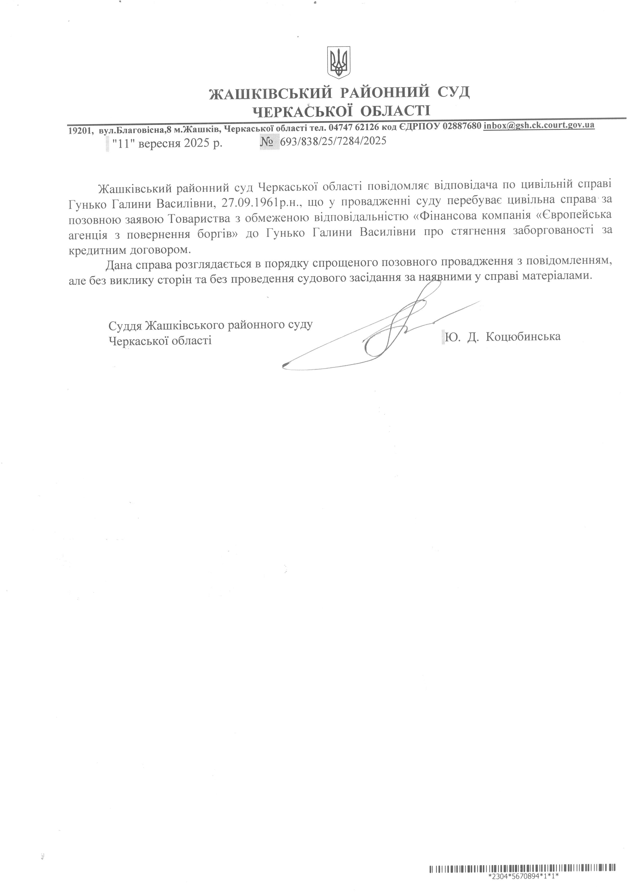 Оголошення про виклик у судове засідання Гунько Г.В.