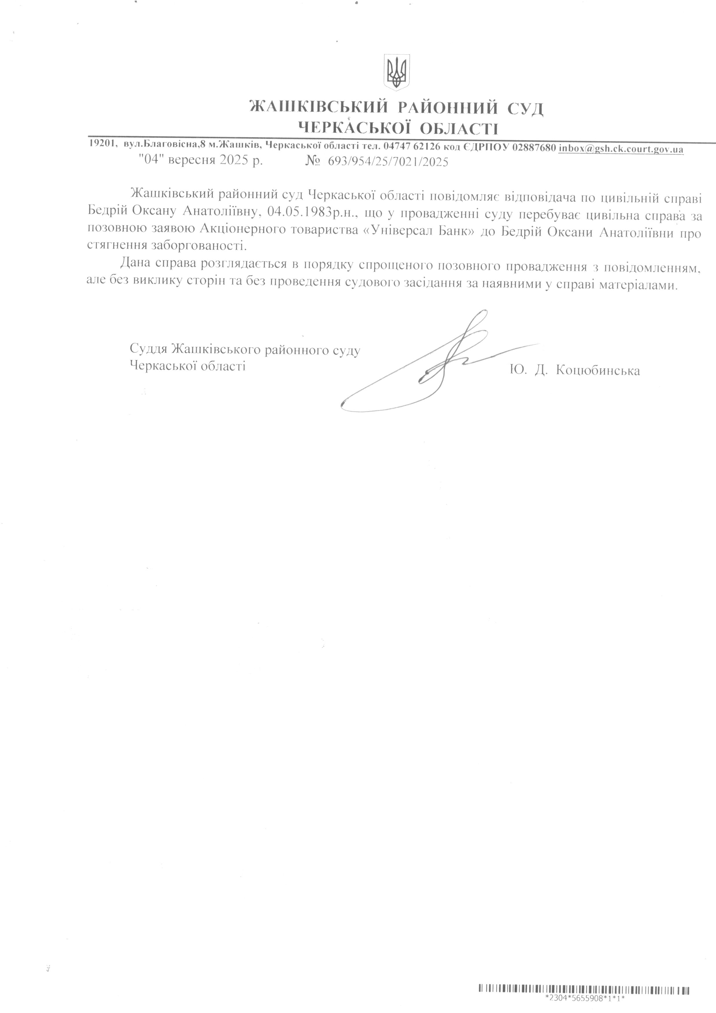 Оголошення про виклик у судове засідання Бедрій О.А.