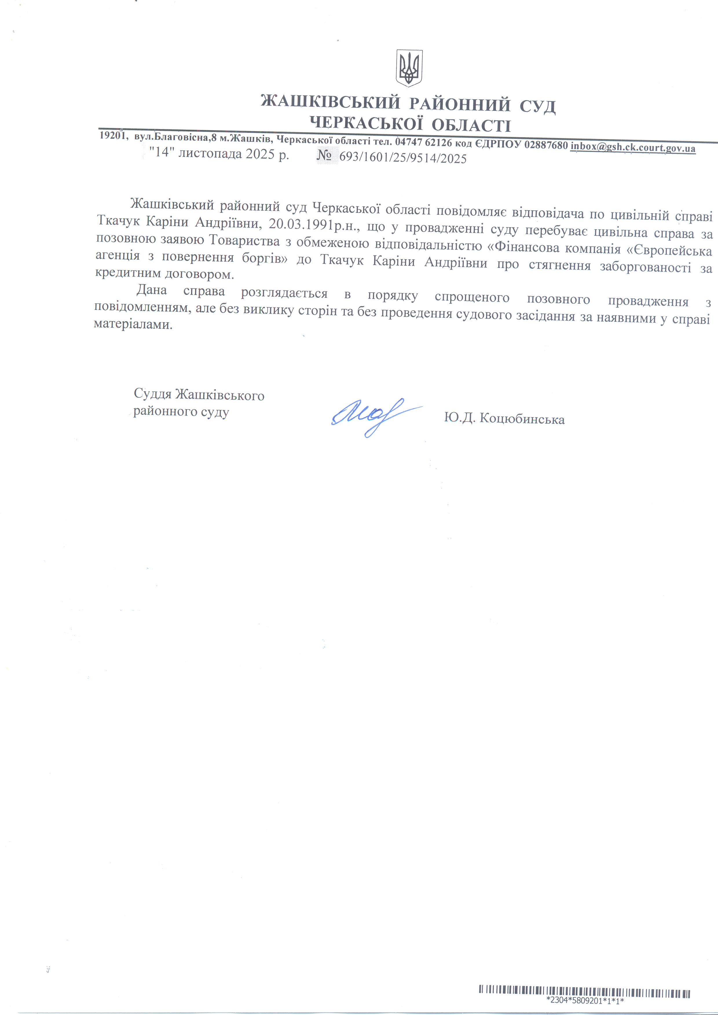 Оголошення про виклик у судове засідання Ткачук К.А.