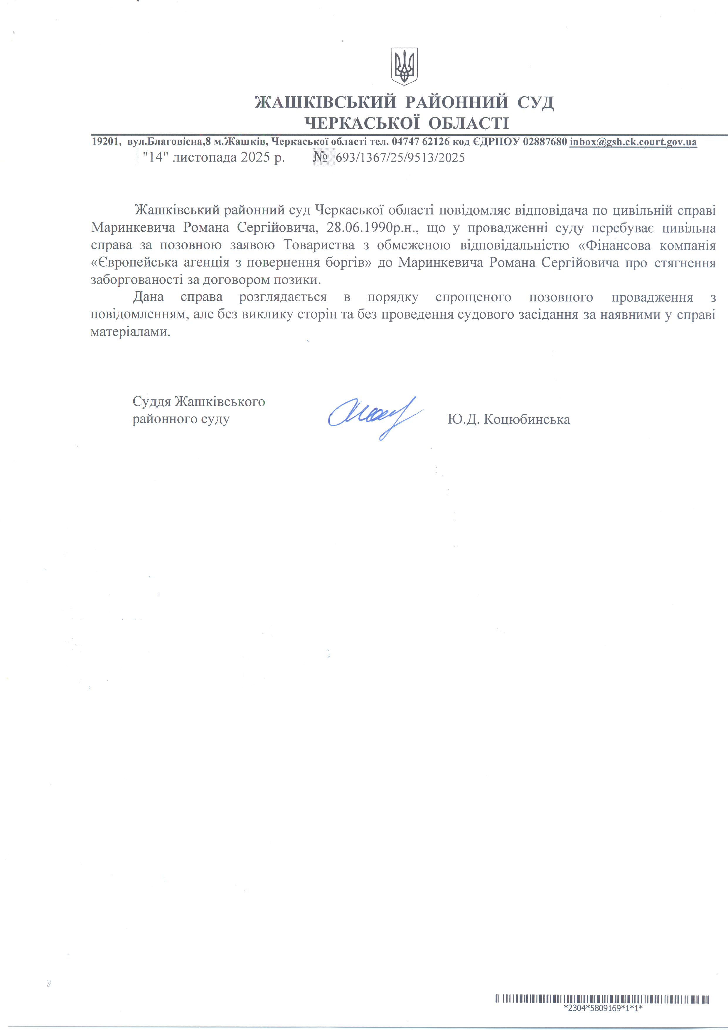 Оголошення про виклик у судове засідання Маринкевича Р.С.