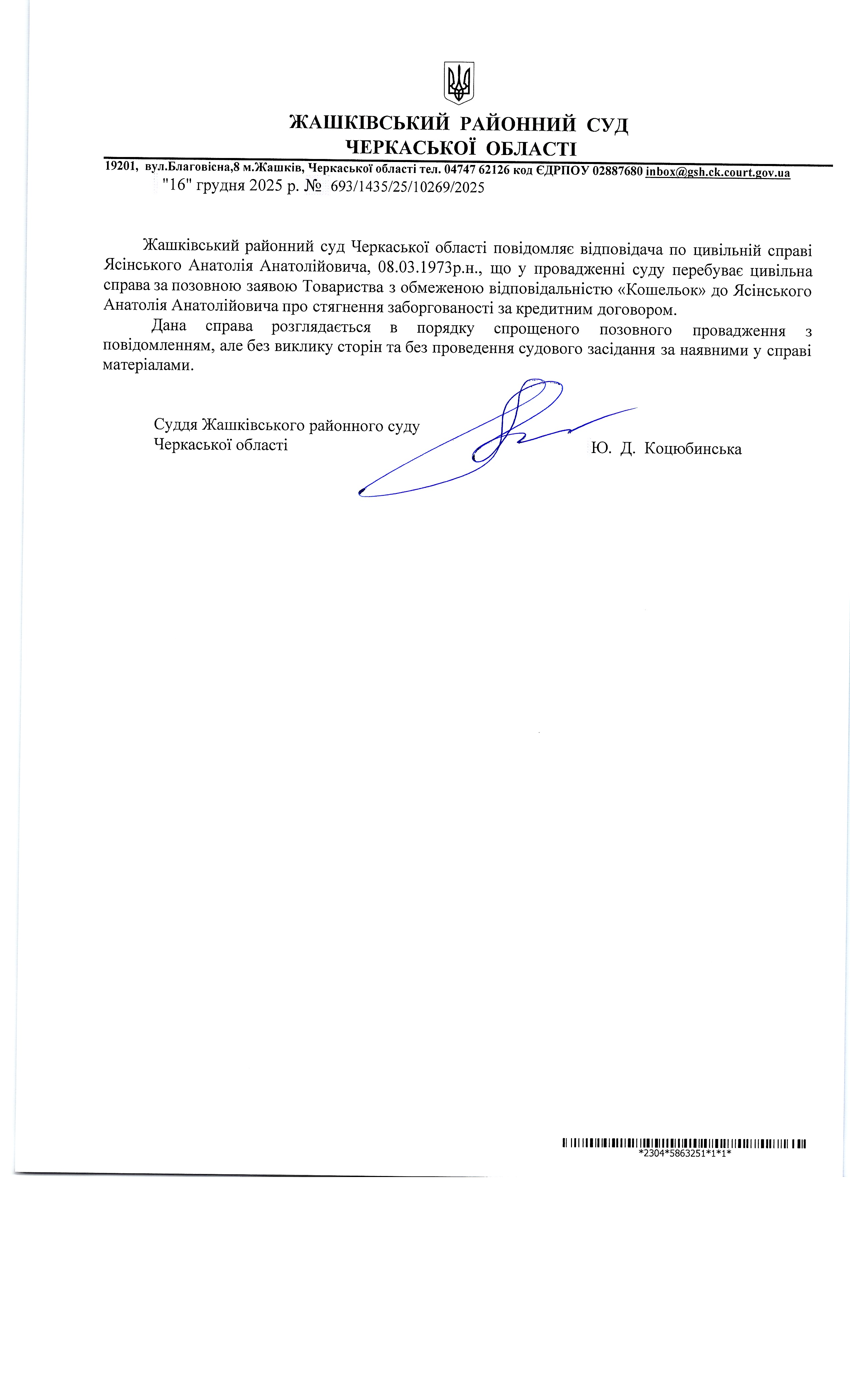 Оголошення про виклик у судове засідання Ясінського А.А.