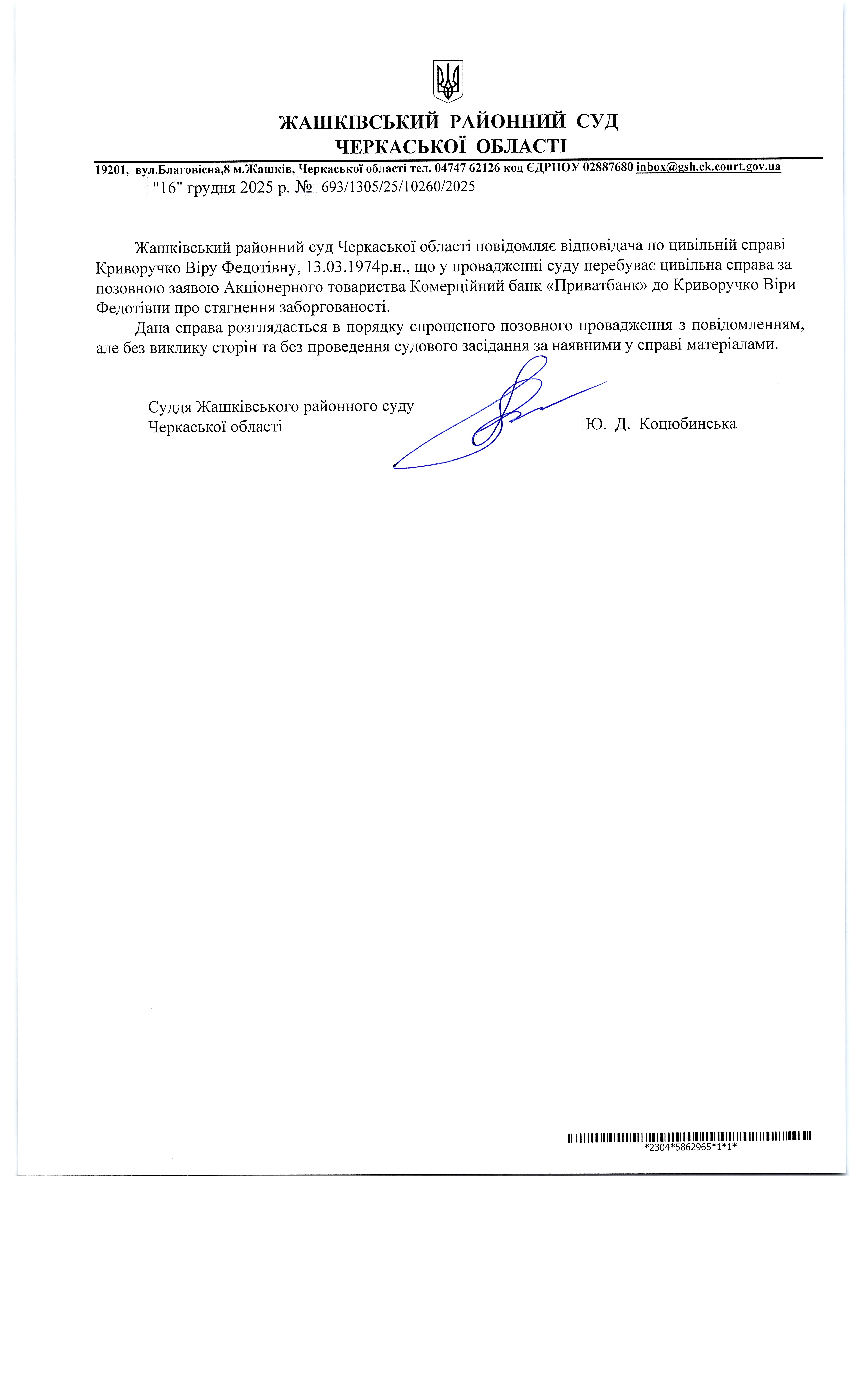 Оголошення про виклик у судове засідання Криворучко В.Ф.